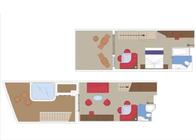 Luxusné dvojpodlažné apartmány MSC Yacht Club Duplex Suites s veľkými balkónm, privátnymi vírivkami, a s veľkou otvorenou obývacou / jedálenskou časťou .